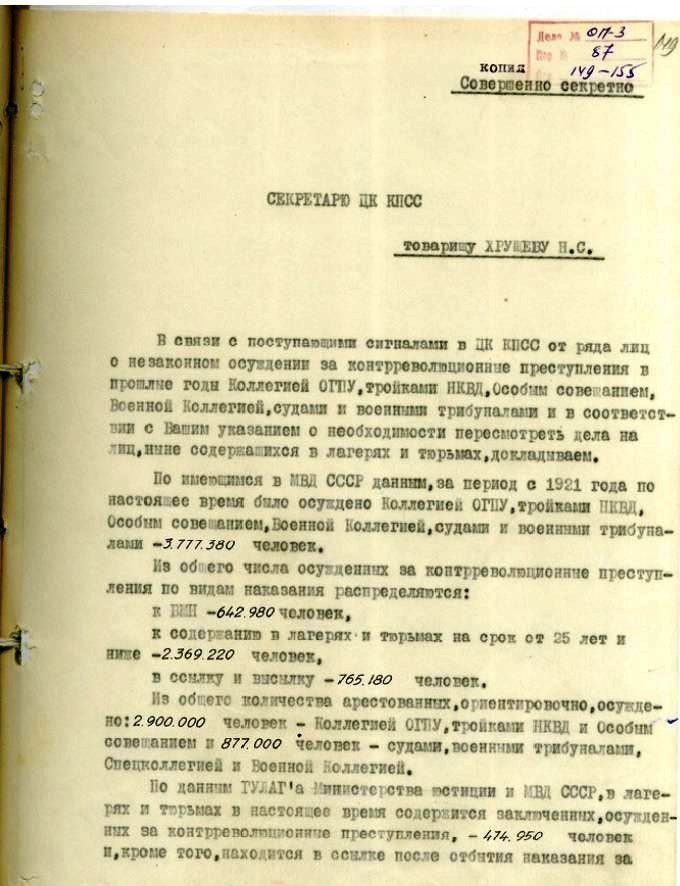 დოკუმენტის სანდოობას ადასტურებს ფაქტი, რომ ის კონკრეტულად ნიკიტა ხრუშოვისთვის მომზადდა. დოკუმენტს ხელს აწერენ : სსრკ გენერალური პროკურორი რომან რუდენკო, სსრკ შინაგან საქმეთა მინისტრი სერგეი კრუგლოვი და სსრკ იუსტიციის მინისტრი კონსტანტინე გორშენინი.